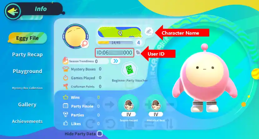3. Die Eggy Party-Benutzer-ID und der Charaktername werden angezeigt