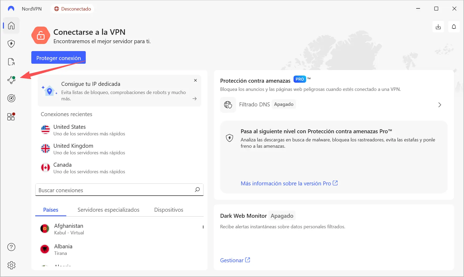 2️⃣ Busca el símbolo "Meshnet" en la interfaz de la aplicación y activa la función. El símbolo de Meshnet consiste en cuatro círculos conectados entre sí.