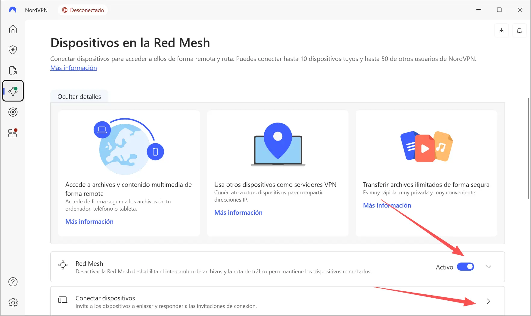 La función Meshnet de NordVPN conecta dispositivos en diferentes ubicaciones en una red doméstica virtual compartida. Esto hace que las computadoras y los teléfonos inteligentes parezcan estar en el mismo WiFi. De esta manera, se pueden compartir conexiones de forma segura o acceder a contenido restringido por ubicación.