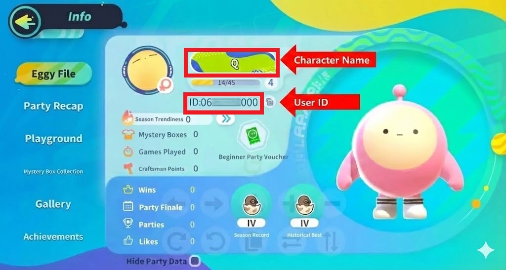 3. 画面に Eggy Party のユーザー ID とキャラクター名が表示されます。