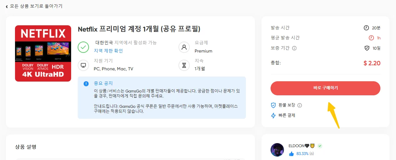 GamsGo에서 넷플릭스 프리미엄을 구독하는 과정은 아주 간단해서 몇 분 안에 등록과 결제 모두 끝낼 수 있어요: