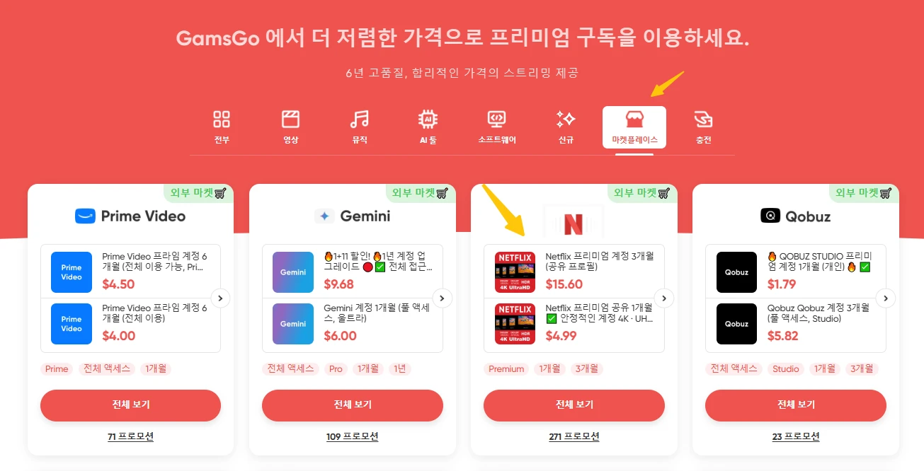 최근 GamsGo는 마켓플레이스 섹션을 새롭게 추가하여 사용자들에게 더욱 풍부한 구독 선택지를 제공합니다. 이 마켓플레이스에는 검증된 신뢰할 수 있는 판매자들이 넷플릭스 프리미엄 계정을 제공하며, 공식 가격보다 훨씬 저렴한 가격에 안전하게 이용할 수 있습니다.