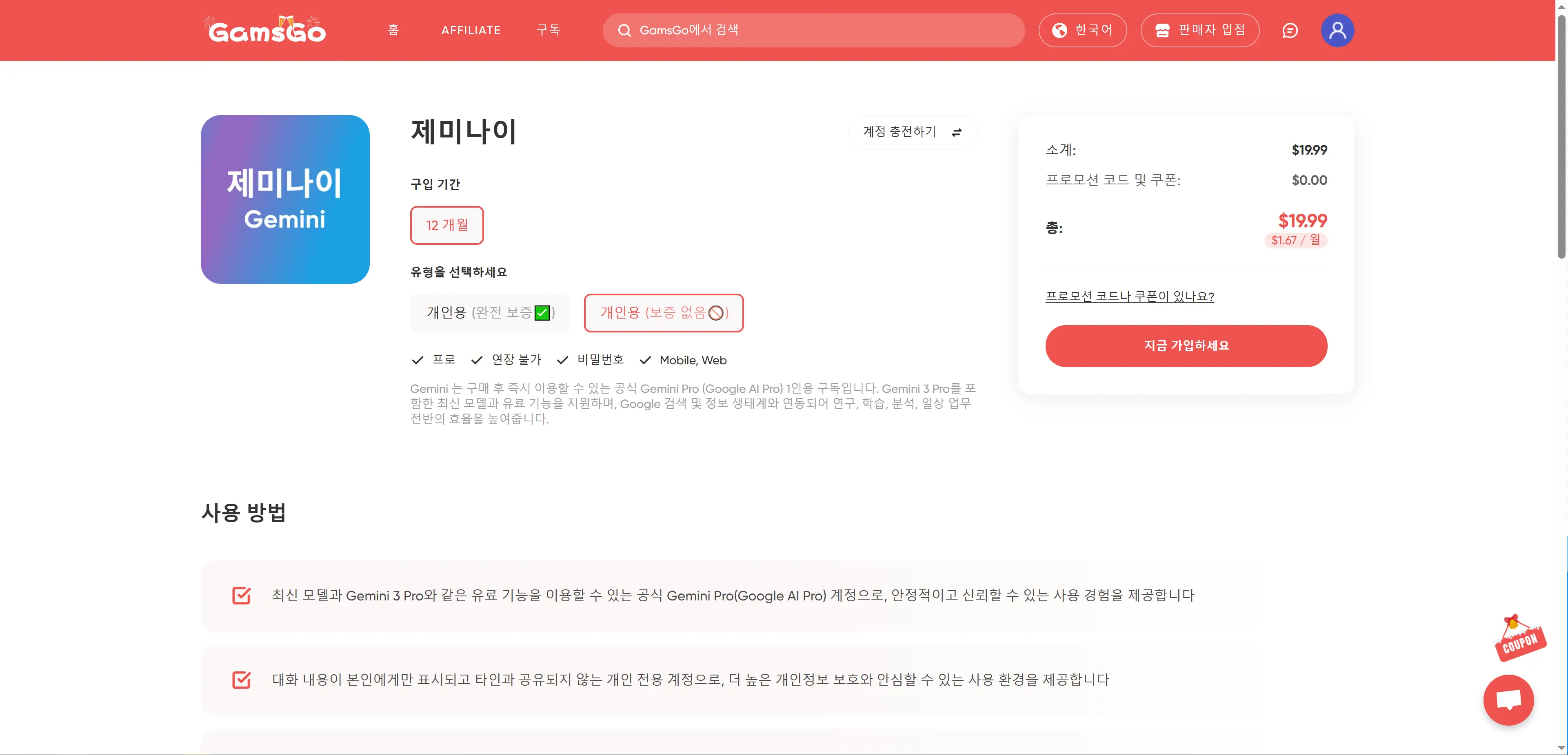 GamsGo 마켓플레이스를 통해 더 저렴한 가격으로 Gemini Pro 구독 — 장기적이고 안정적인 액세스에 이상적입니다.