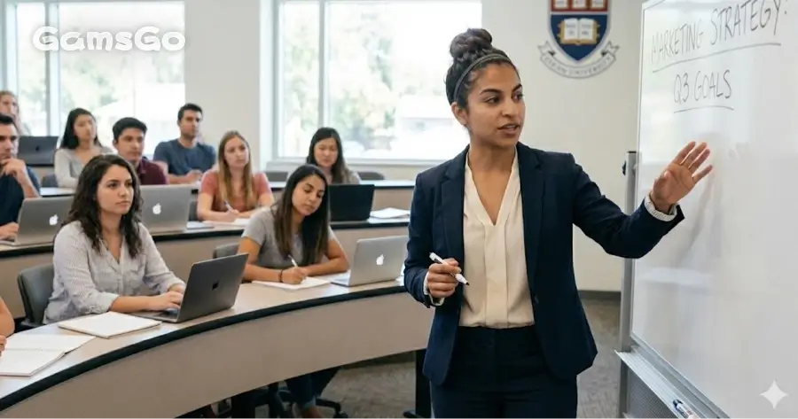 프롬프트: 그 여성이 대학에서 강의를 하고 있다.