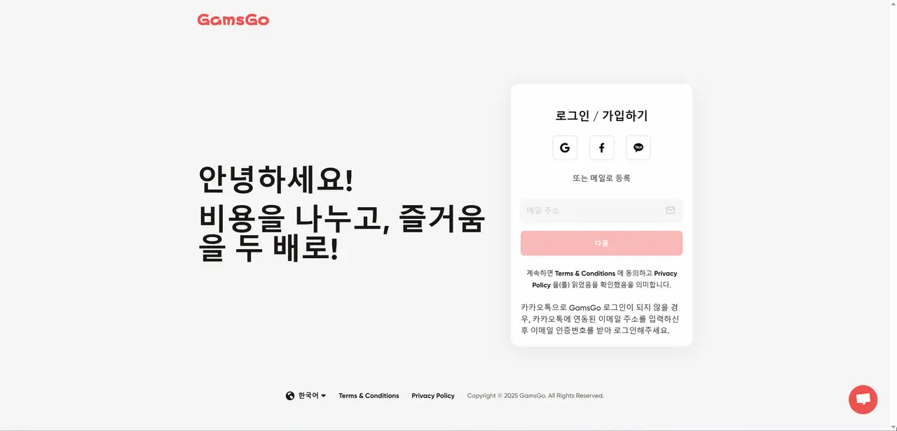 1️⃣ GamsGo 공식 홈페이지 접속 → 오른쪽 상단 ‘로그인 / 회원가입’ 클릭