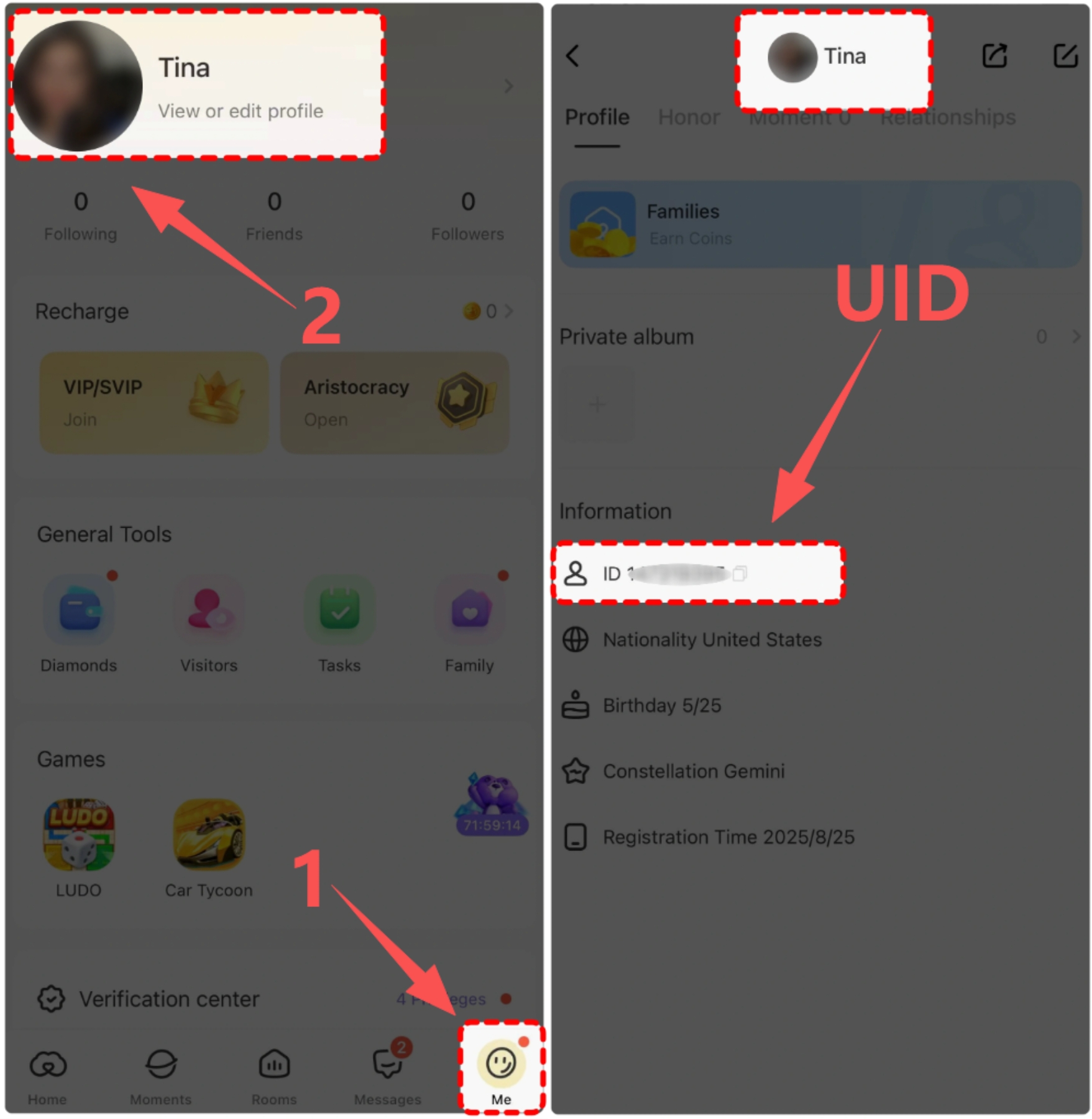 • 进入 SUGO 应用的个人主页,您的 UID 将显示在信息栏中。